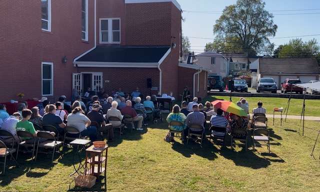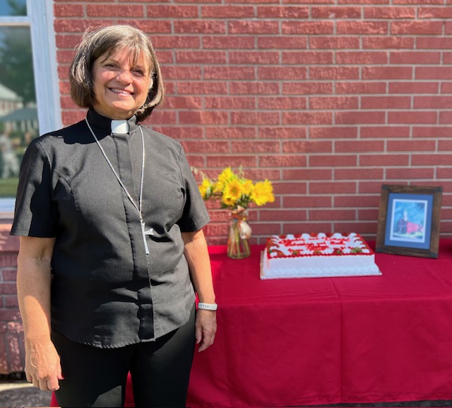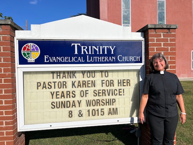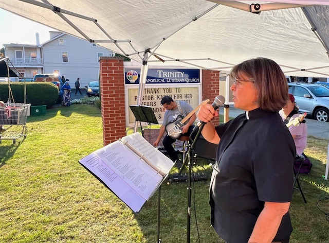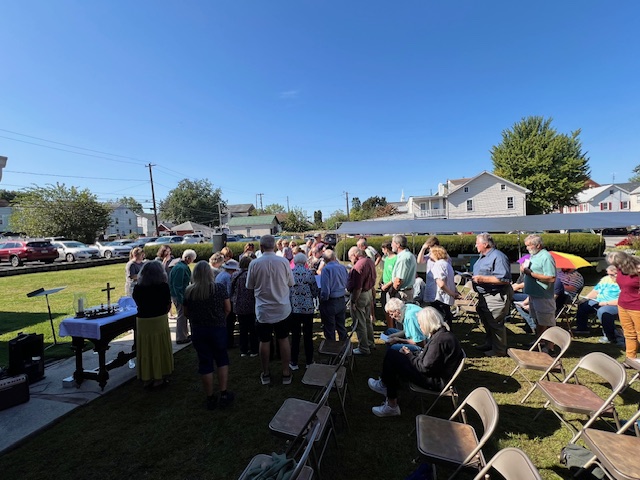 The sun was shining and the morning sky was a bright blue on this beautiful fall day as we worshipped outside at 10:15 and then had our annual fall picnic. It was a bittersweet day, as Pastor Karen preached her last lesson here at Trinity Church, and we sent her into retirement with our many blessings..