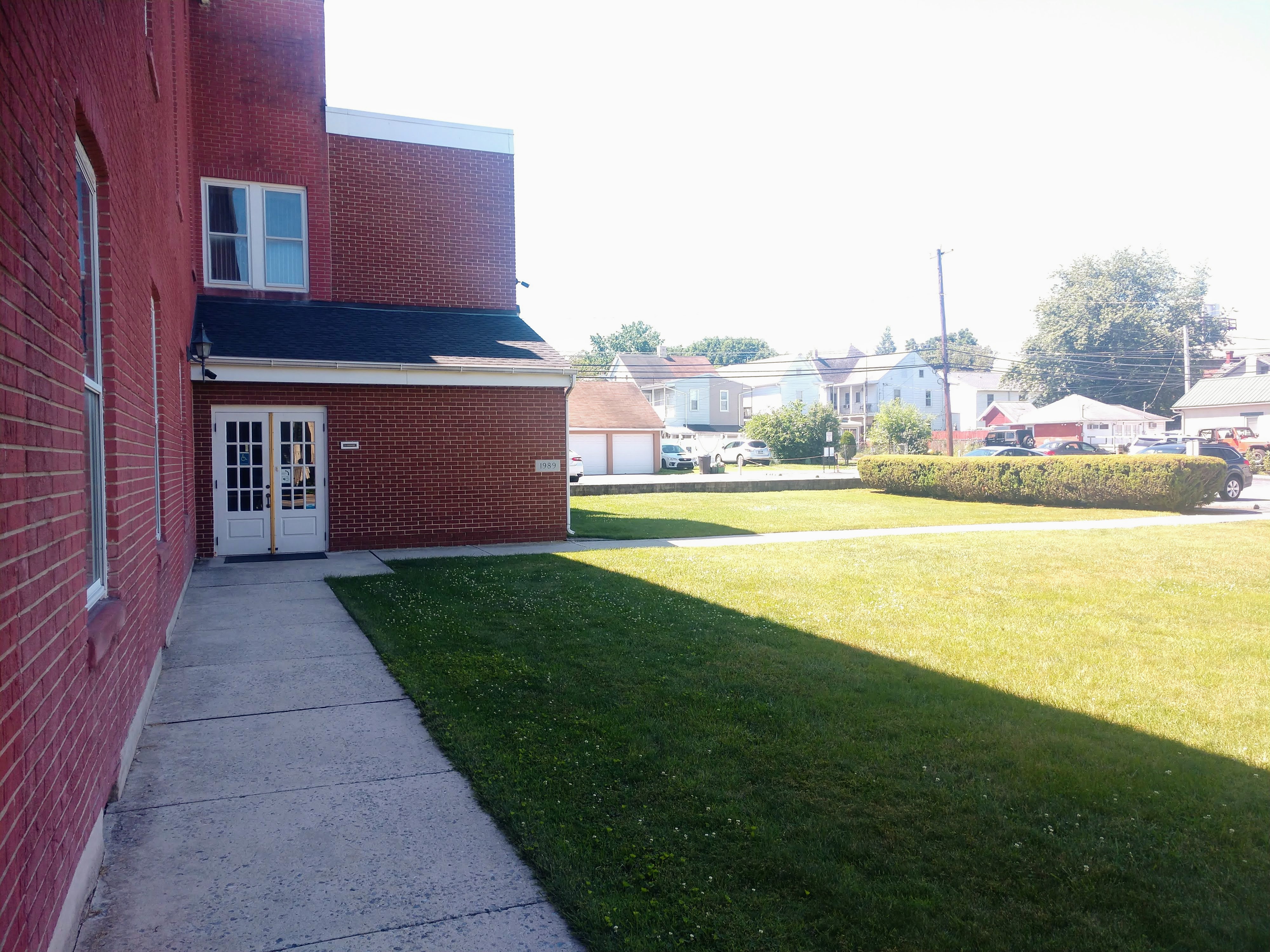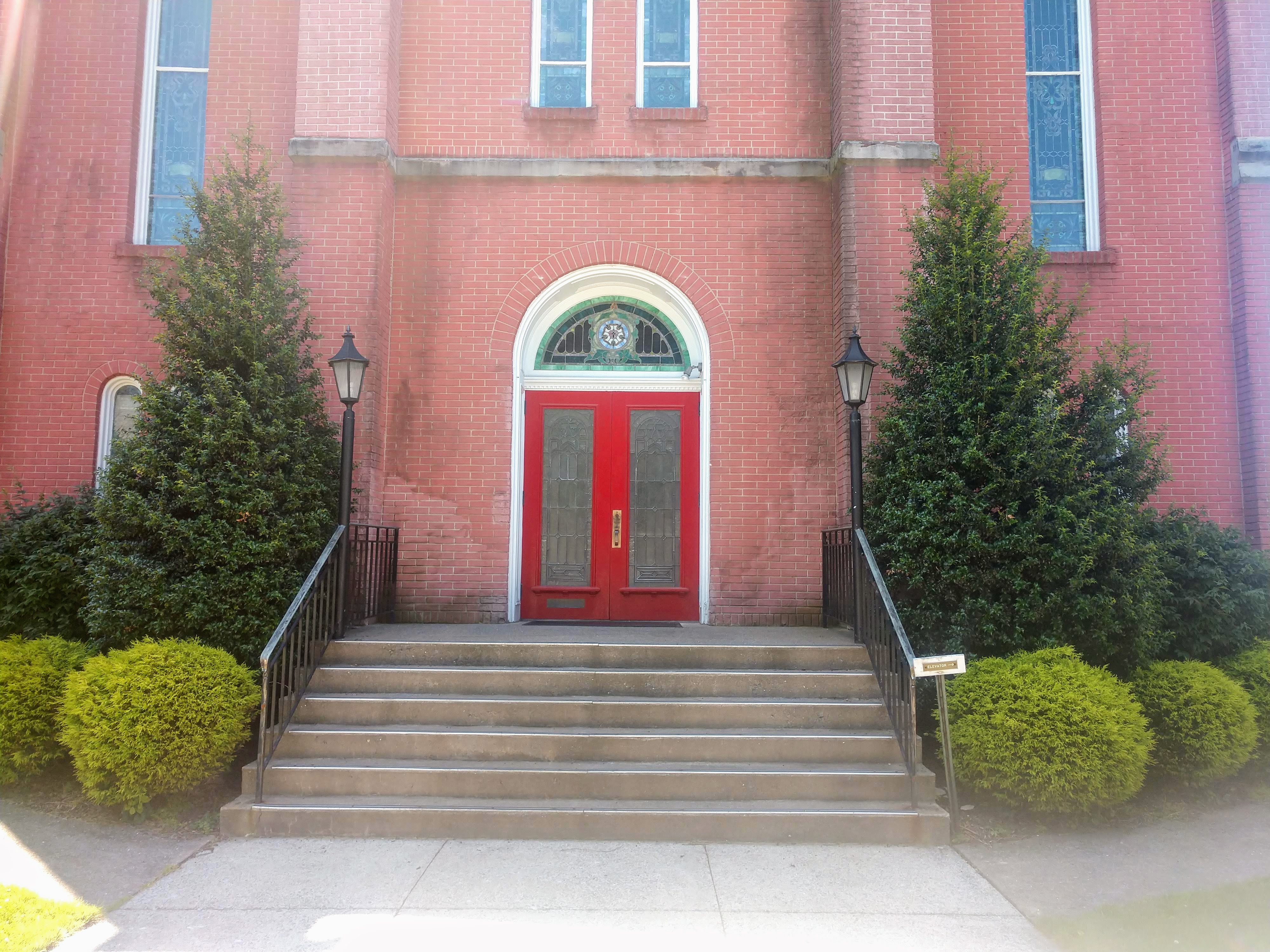 On Sunday morning, there are two available entrances. The first is the front door located along Main Street and the second is located on the west side of our building and connected to the parking lot via a sidewalk. An elevator is located adjacent to the west door.