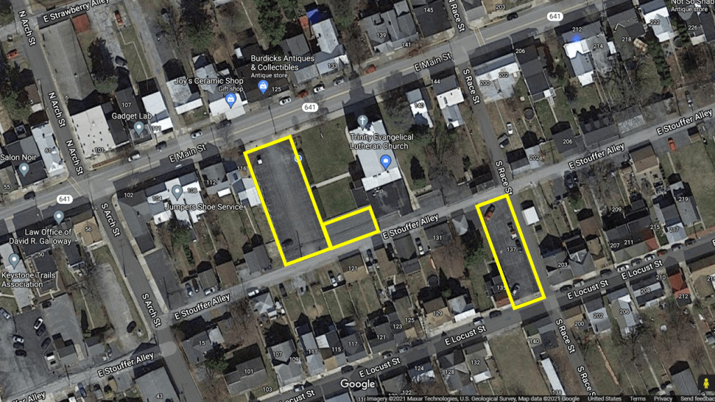 We have an abundance of parking available for your visit! We have a large parking lot accessible from Main Street and Stouffer Alley; additional parking is available on Main Street, along Stouffer Alley, and in the back parking lot between Stouffer Alley and Locust Street. The parking lots are outlined in yellow below.